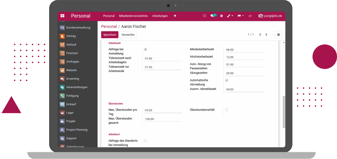 ITISeasy.business can help here professionally: In this there is an integrated, extensive attendance time recording. The configuration can be done per employee: For example, break times are taken into account, and the included item principle leads to correct, voucher-based working time accounts. Automatic sign-offs, if someone forgets to clock out, can also be activated. And the respective working time model and also a query of the work location (e.g. home office) is of course taken into account.